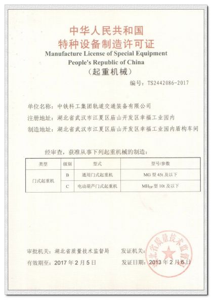 | 中华人民共和国特种设备制造许可证门式起重机C级 |