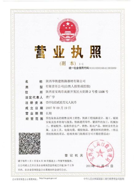 | 持证单位: 陕西华铁建铁路器材有限公司 |